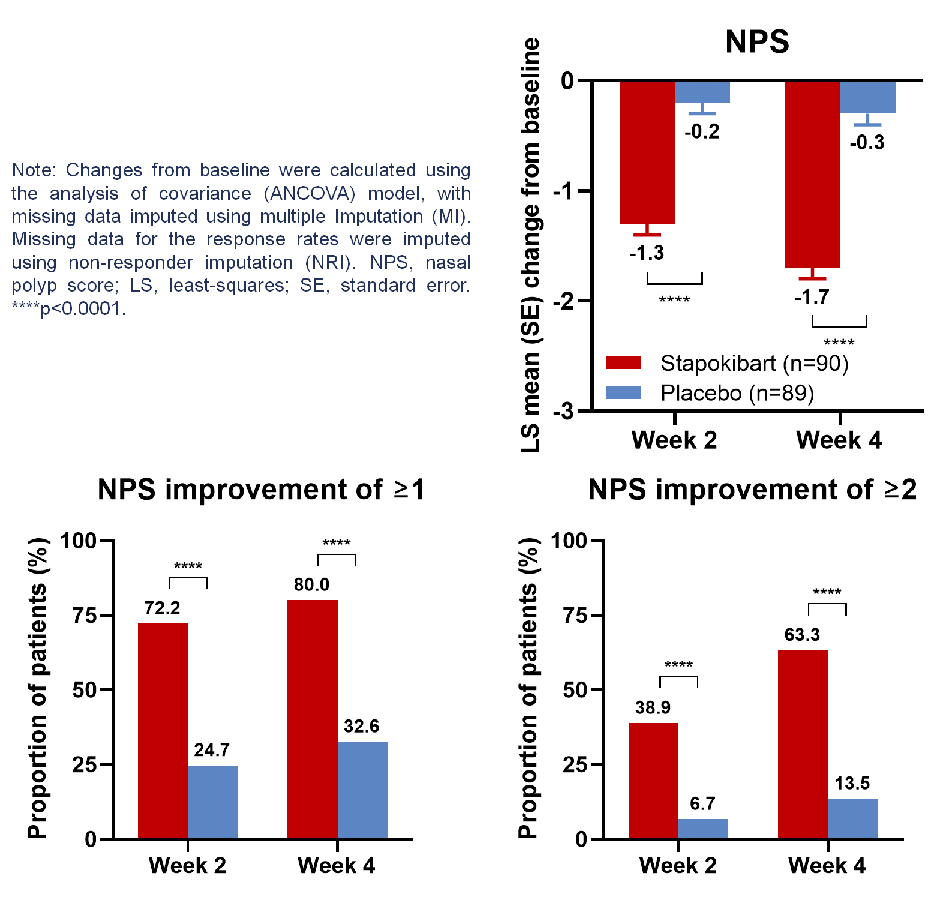 疗效分析显示,在第2周的首次评估时,司普奇拜单抗即显著改善了鼻息肉评分(NPS)。与安慰剂相比,第2周,司普奇拜单抗组NPS较基线改善程度具有显著优势(组间差值的最小二乘[LS]均值-1.1,95% CI:-1.3~-0.8,p<0.0001),且在第4周进一步改善(-1.4,95%CI:-1.7~-1.1,p<0.0001)。在第2周时,司普奇拜单抗组NPS较基线改善≥1分和≥2分的应答率分别为72.2%和38.9%,显著高于安慰剂组的24.7%和6.7%;在第4周时,应答率进一步升至 80.0%和63.3%,而安慰剂组分别为32.6%和13.5%(均 p<0.0001)(图2)。 值得注意的是,司普奇拜单抗从第1天起即在TSS日平均值较基线上显示显著改善(最小二乘均值差-0.2,95%CI:-0.4~0.0,p=0.0465)。 在TSS周平均值较基线方面,司普奇拜单抗自第1周起即较安慰剂组有显著改善(最小二乘均值差-0.4,95%CI:-0.6~-0.2,p=0.0006),且在第2–4周持续改善。此外,司普奇拜单抗自第 1 周起即显著提高了嗅觉丧失评分改善≥0.5的应答率(13.3% vs. 3.4%,p=0.0186)。