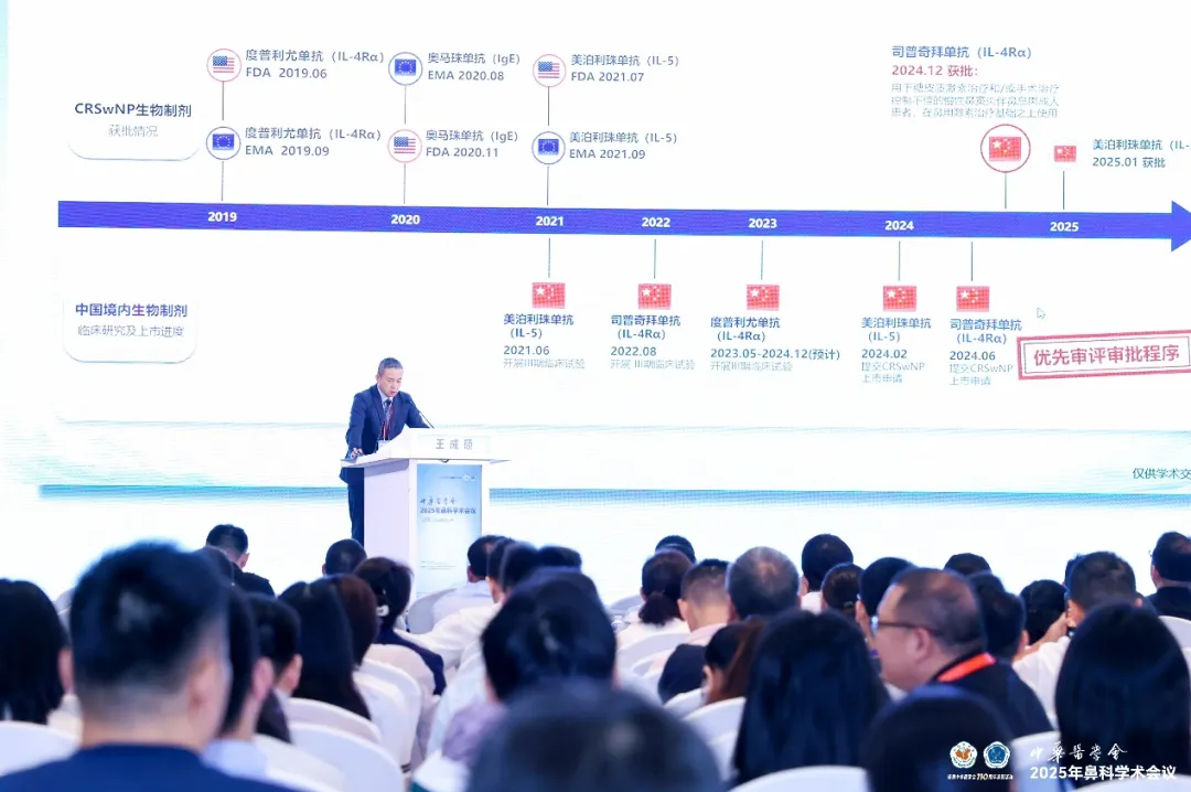 会上,首都医科大学附属北京同仁医院王成硕教授作为嘉宾,围绕《破局而来——从中国意见书看生物制剂治疗CRSwNP的优越性》做专题报告。王成硕教授介绍了《生物制剂治疗慢性鼻窦炎伴鼻息肉中国意见书》的核心要点,指出生物制剂打破了难治性慢性鼻窦炎伴鼻息肉的复发难题。真实世界研究数据显示,司普奇拜单抗快速起效、强效持久,停药10周仍可获益。它精准靶向IL-4Rα,双重阻断信号通路,直击病理核心,减轻炎症反应,重塑了治疗格局。